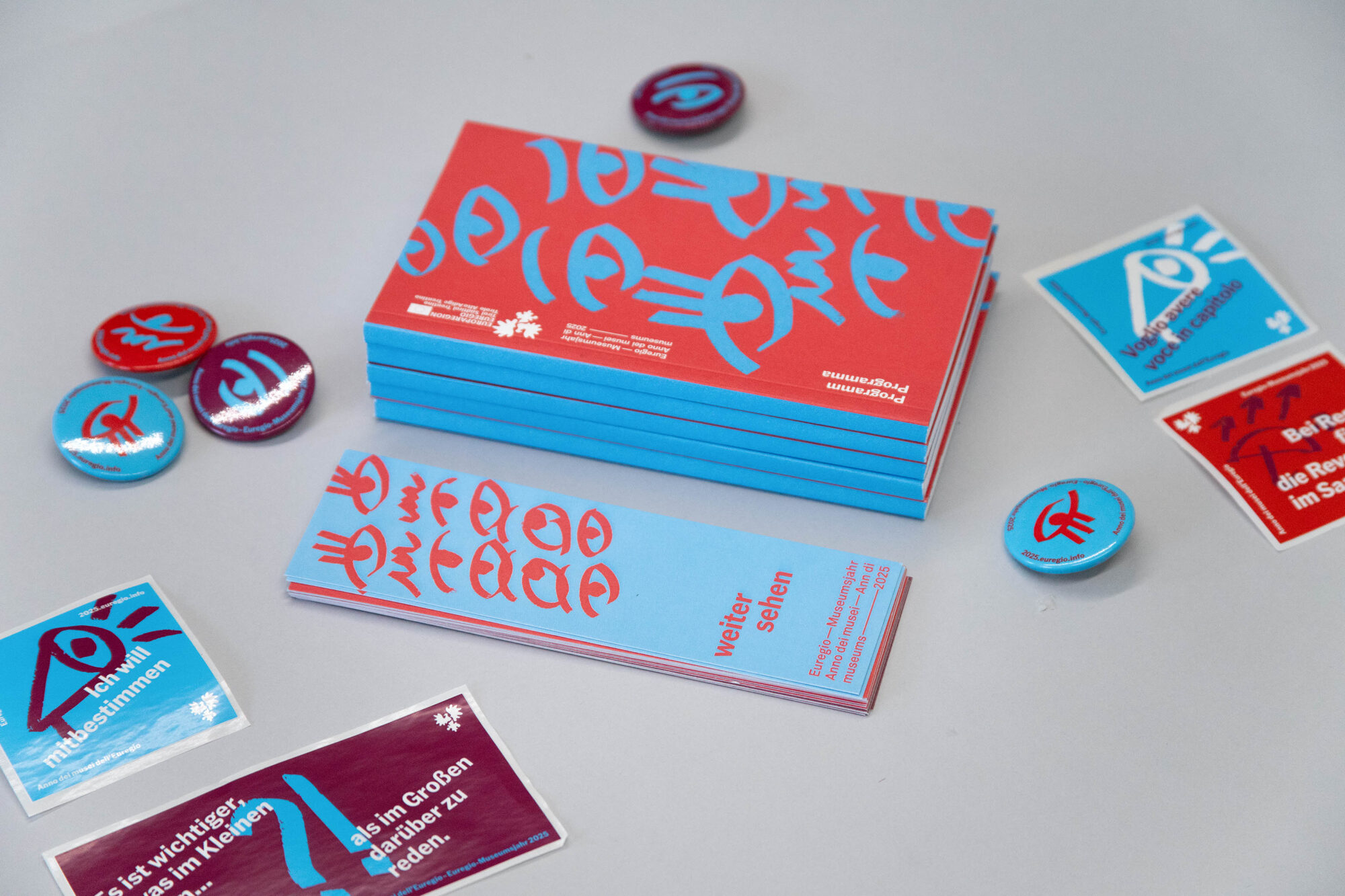Die gedruckten Materialien umfassen Plakate, eine Broschüre mit dem vollständigen Programm, Lesezeichen, Aufkleber und Anstecknadeln, die für jedes Museum erhältlich sind, sowie Banner für öffentliche Räume und offizielle Veranstaltungen.