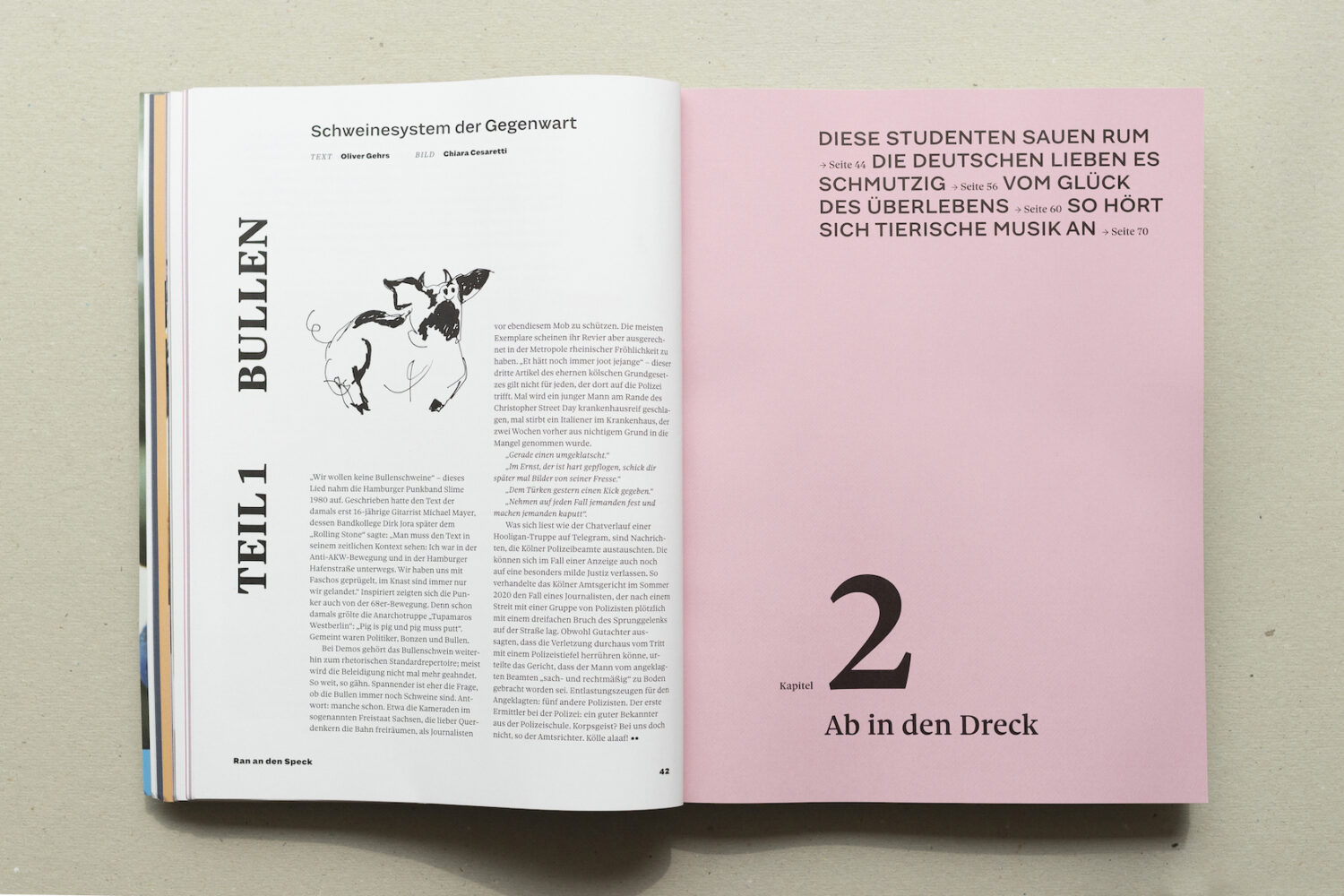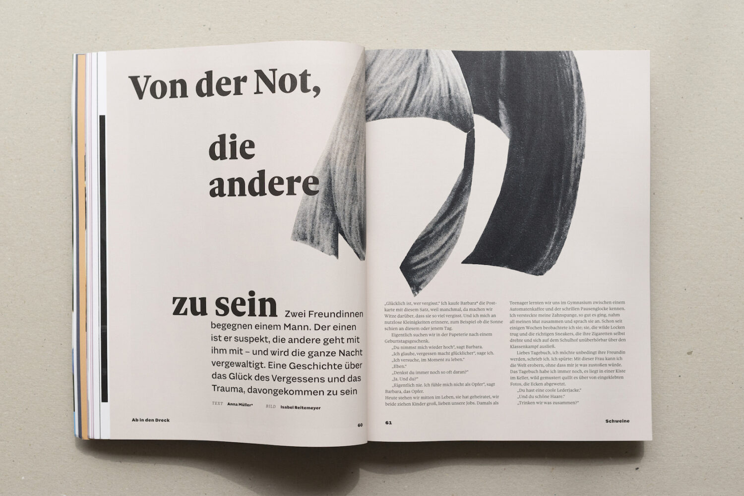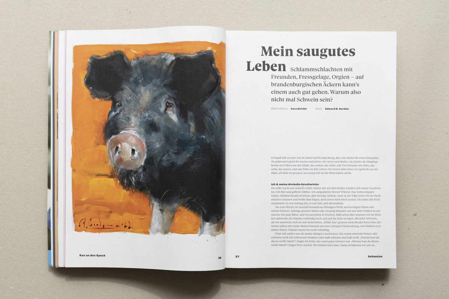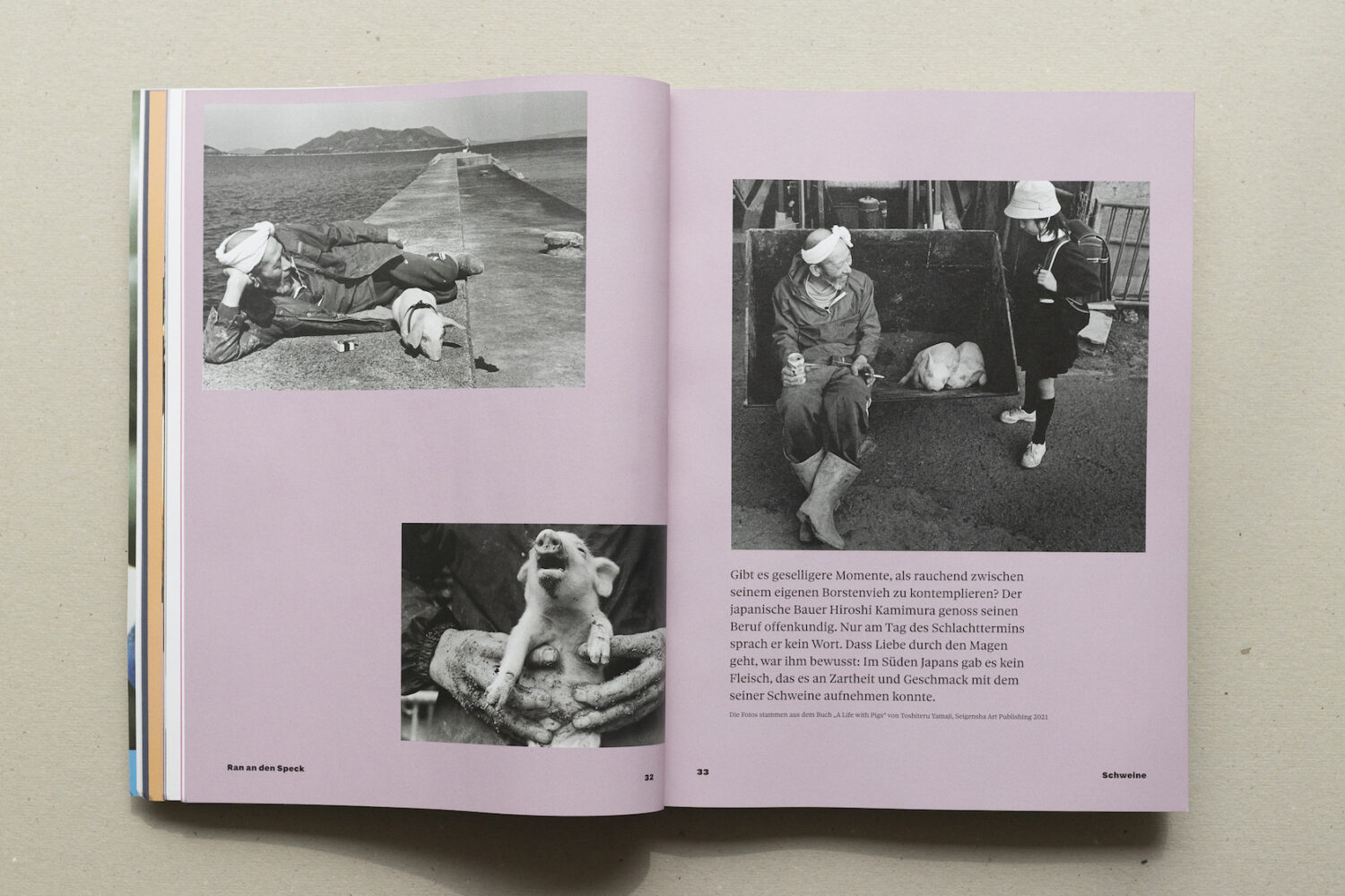Für diese Ausgabe haben wir uns für ein Farbschema entschieden, das die verschiedenen Tonalitäten und Farben von Schweinen aufgreift und mit dem traditionell assoziierten Rosa und/oder Pink bricht. Schließlich sind nicht alle Schweine rosa. Das Farbschema ist ein Element, das sich durch das gesamte Magazin zieht und auf unterschiedliche Weise verwendet wird, wodurch eine Harmonie im gesamten Magazin entsteht.