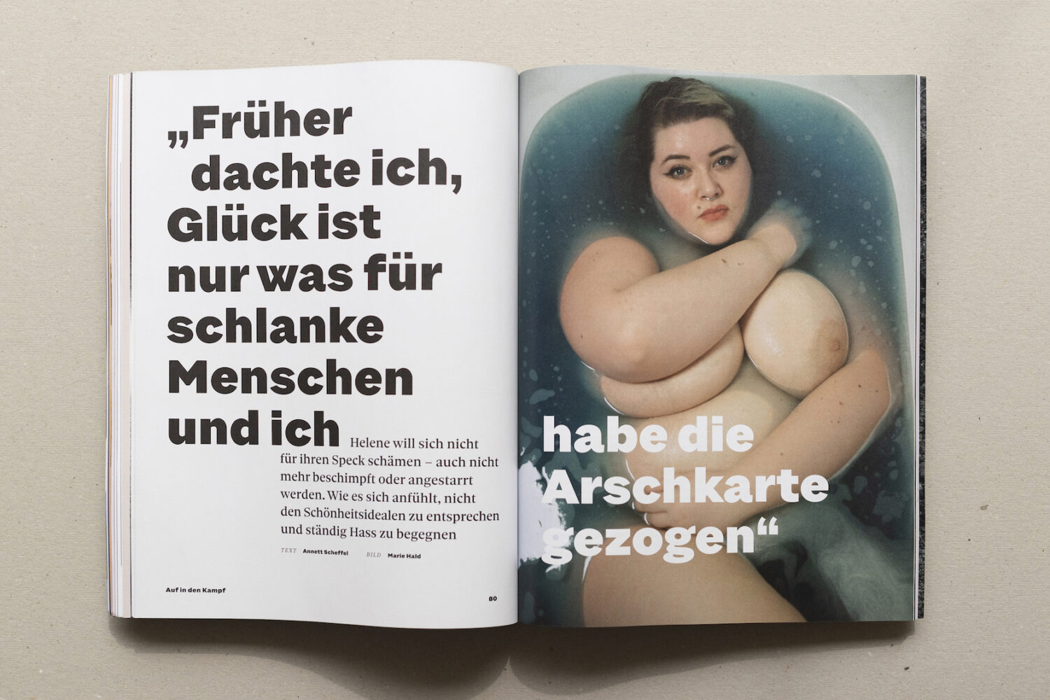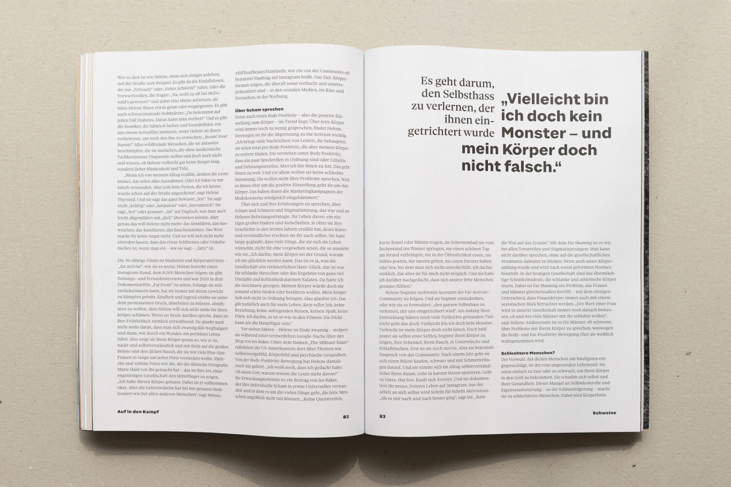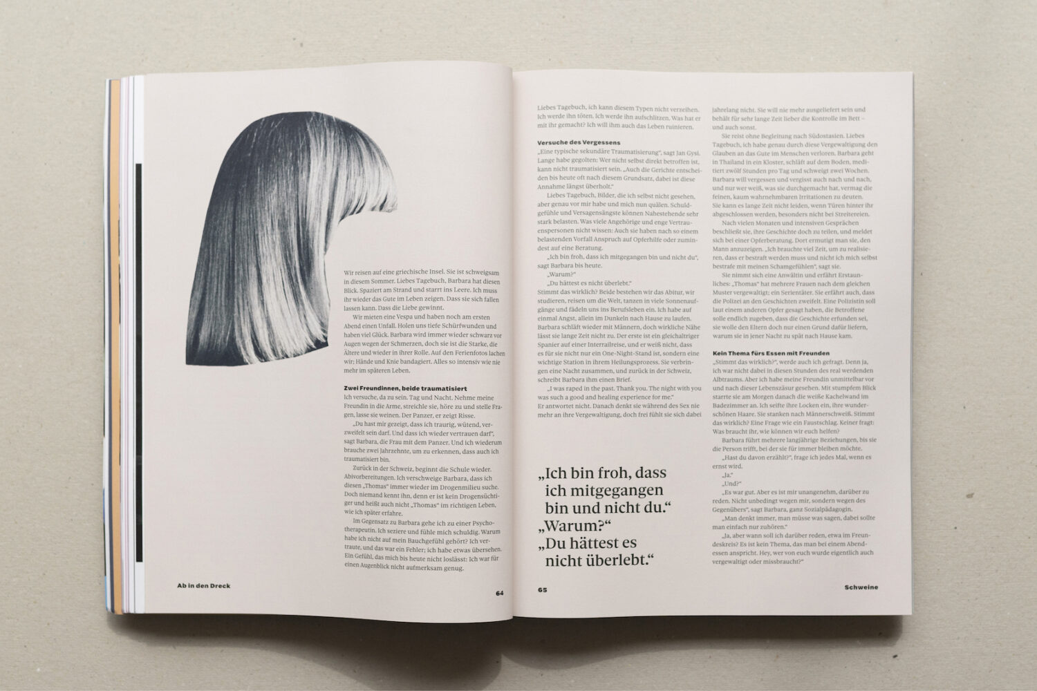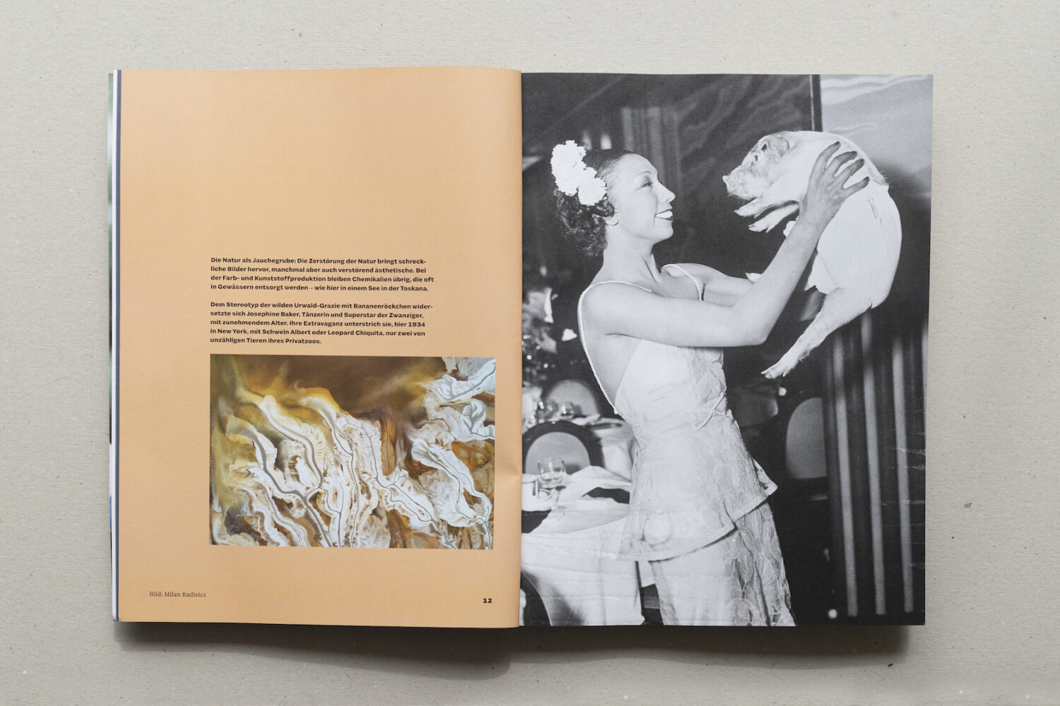 Für diese Ausgabe haben wir uns für ein Farbschema entschieden, das die verschiedenen Tonalitäten und Farben von Schweinen aufgreift und mit dem traditionell assoziierten Rosa und/oder Pink bricht. Schließlich sind nicht alle Schweine rosa. Das Farbschema ist ein Element, das sich durch das gesamte Magazin zieht und auf unterschiedliche Weise verwendet wird, wodurch eine Harmonie im gesamten Magazin entsteht.