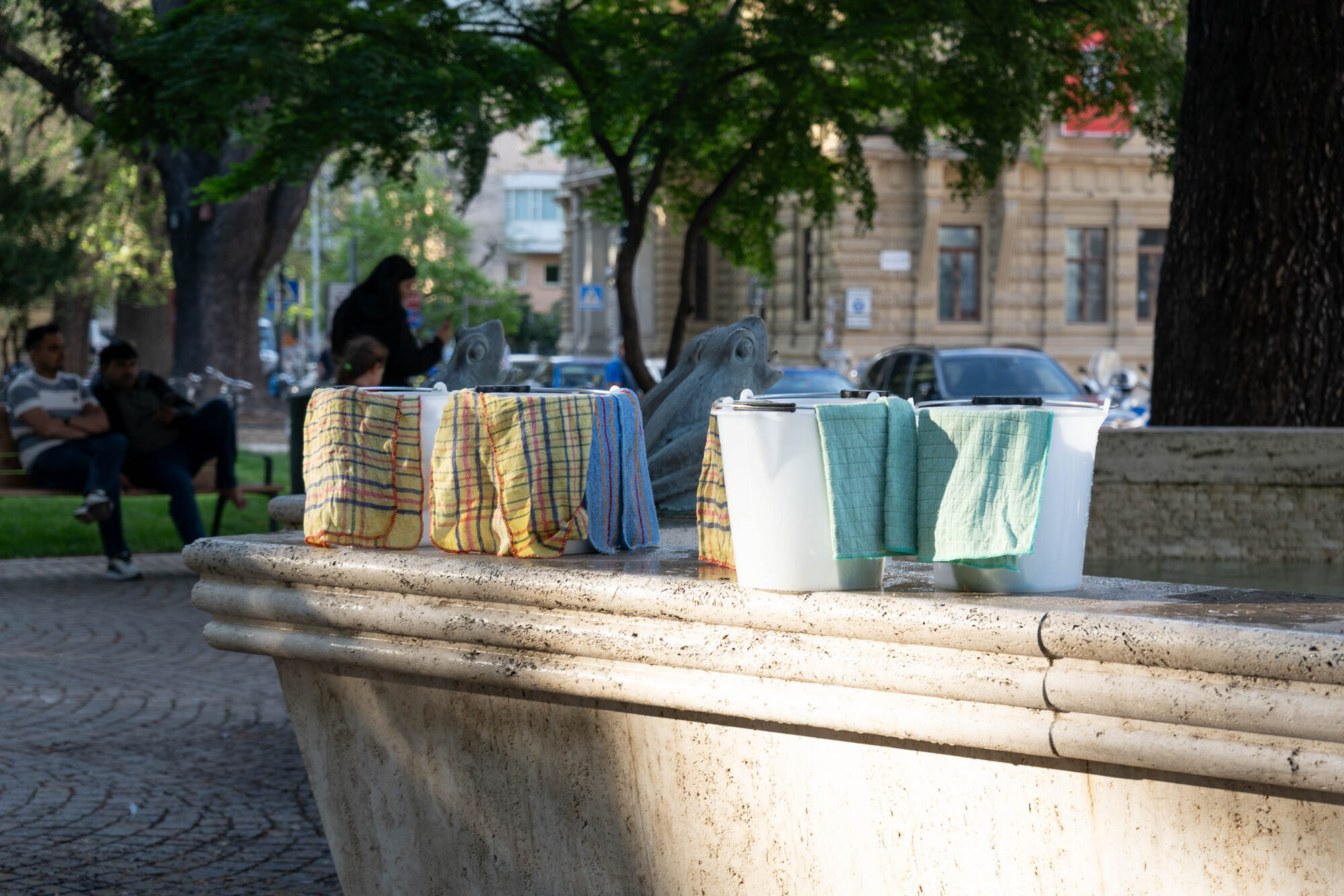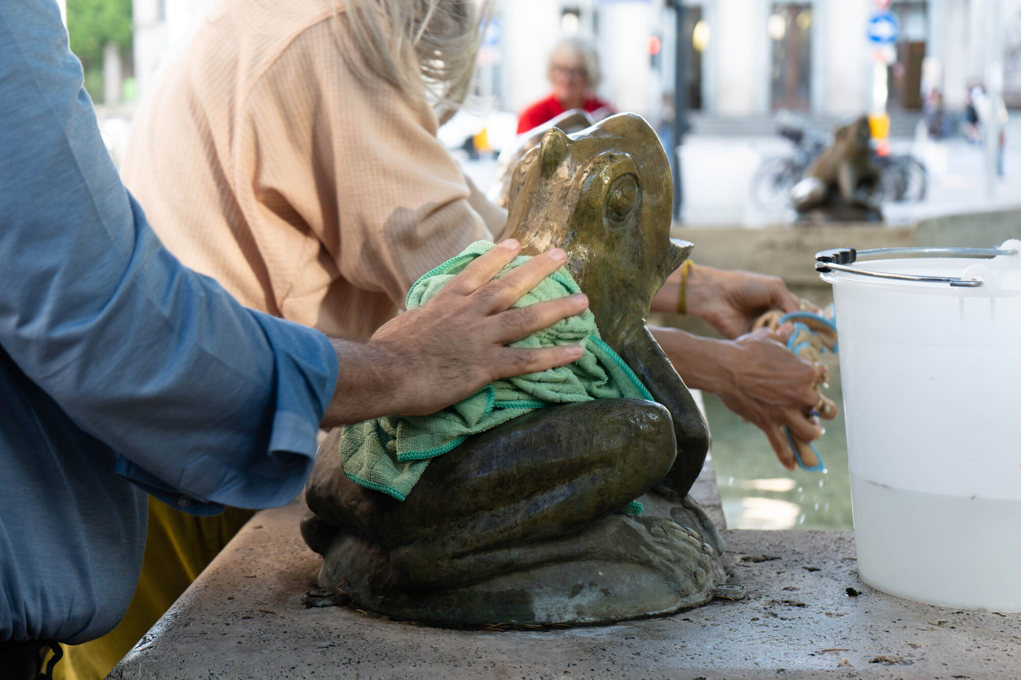 Wie nass werden wir, wie nass ist Nässe, was bekommen wir vom Nasswerden, wie lange halten unsere nassen Spuren des Flusses auf dem Stadtplatz, wie können wir neue Vorstellungen mit fließenden Bildern schaffen?