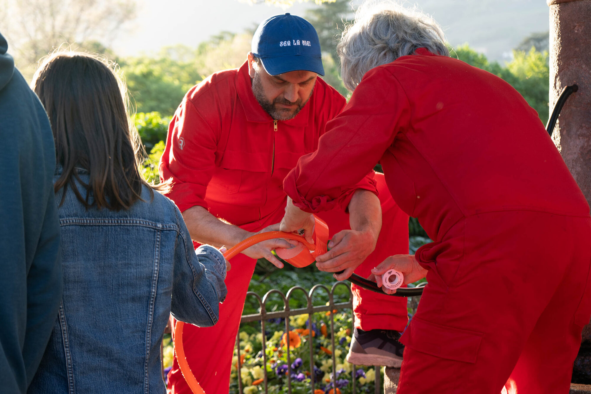Ausgehend von diesen ersten Überlegungen zur Materialität des Wassers beginnen die drei Praktizierenden der Residenz ihre Erkundung mit einer Methode, die durch den aktiven Einsatz von Humor, Absurdität und Ironie, aber auch von Banalität gekennzeichnet ist. Diese Gefühle durchdringen ihre gemeinsame Praxis und werden genutzt, um eine niedrigschwellige Atmosphäre zu kultivieren, die die Beteiligung der Menschen fördert, ein Klima der Überraschung als Moment des Ausbruchs aus Routinen ermutigt und ein Handeln „für“ statt „gegen“ etwas unterstützt.