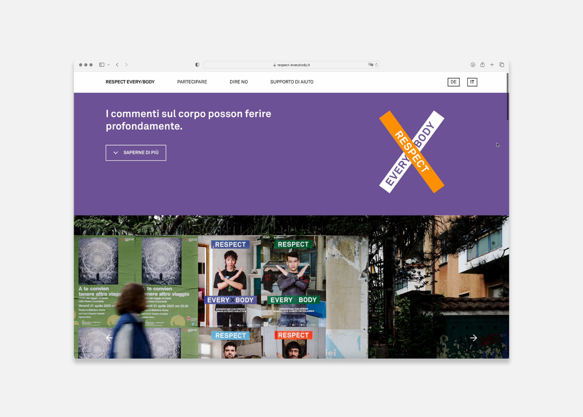 Respect Every/body lädt jeden dazu ein, Botschafter der Kampagne zu werden. Materialien wie Poster, Aufkleber und Anstecknadeln können über die eigens für die Kampagne eingerichtete Website angefordert und abgeholt oder einfach heruntergeladen werden. Die Website respect-everybody.it bietet einen einfachen Überblick über das Thema Körperkommentare und den Umgang mit ihnen. Gleichzeitig wird die Öffentlichkeit durch die bereitgestellten physischen und digitalen Materialien zur Solidarität motiviert.