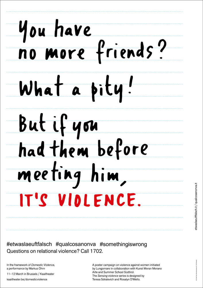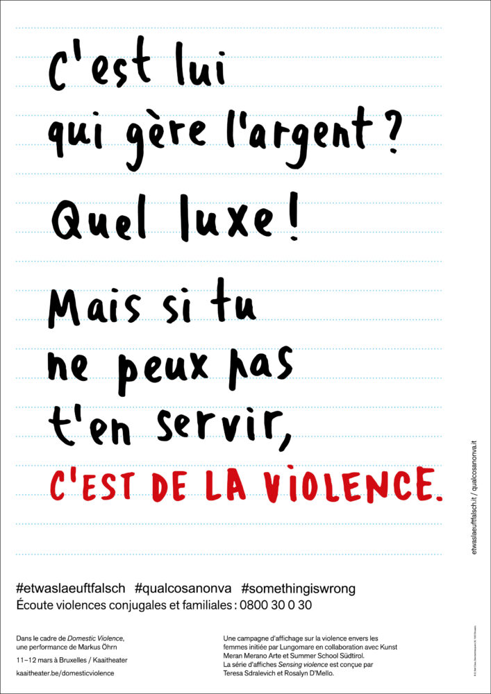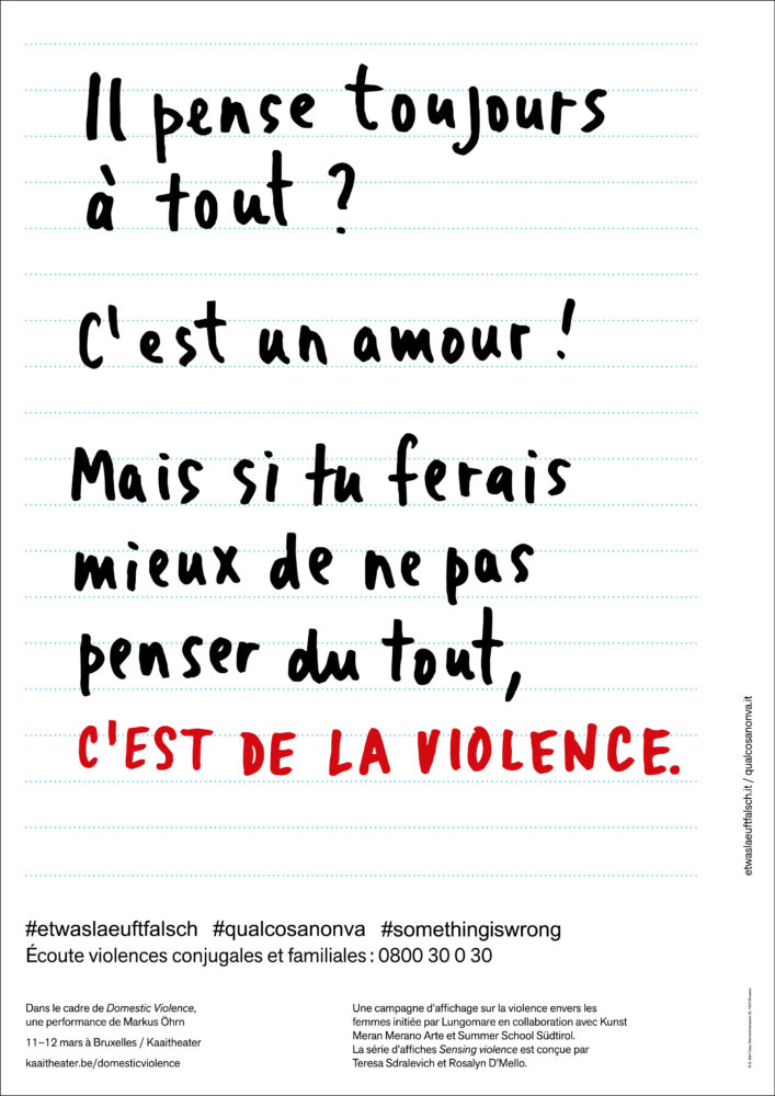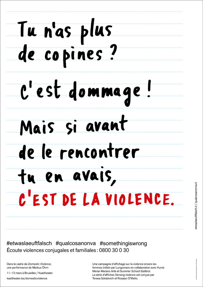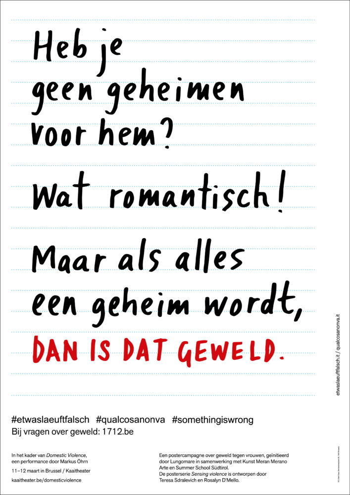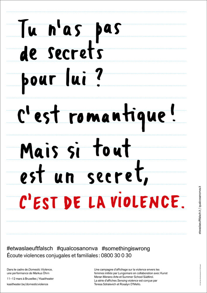 In the context of the performance “Domestic Violence” by Markus Öhrn, the poster series “Sensing Violence” created by Teresa Sdralevich and Rosalyn D’Mello will be shown at the Kaaitheatre and in public space in Brussels. The posters are part of the first edition of #somethingiswrong – Five Campaigns against Violence against Women and have been translated into English, French and Dutch in collaboration with Kaaitheater. Soon, the posters will be available for free download in the three new languages on the #somethingiswrong website.