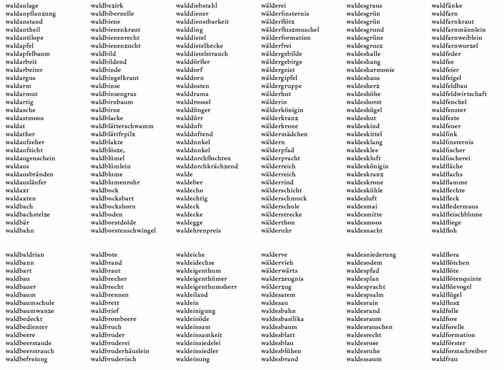 Die Wald Liste è un’invocazione per il bosco ispirata ai 1000 termini che rispondono alla parola Wald (bosco) nel Dizionario tedesco dei Fratelli Grimm. Die Wald Liste è un canto narrato per gli alberi, per il muschio, per tutti gli animali, per l’aria e per tutti i suoni che appartengono al bosco e che vorremmo preservare, un ritmo parlato tra voce umana e natura che diventa dialogo d’amore. Il Deutsches Wörterbuch è il più grande e completo dizionario della lingua tedesca, iniziato dai da Jacob e Wilhelm Grimm a partire dal 1838, rimasto incompiuto al momento della loro morte, e completato postumo nel 1961 seguendo le linee guida dei primi volumi scritti dai due filologi. L’idea era quella di creare uno studio perfettamente completo: le voci includono etimologia, significati, sinonimi, forme dialettali, parole poetiche, per un totale di 330.000 lemmi e 32 volumi.