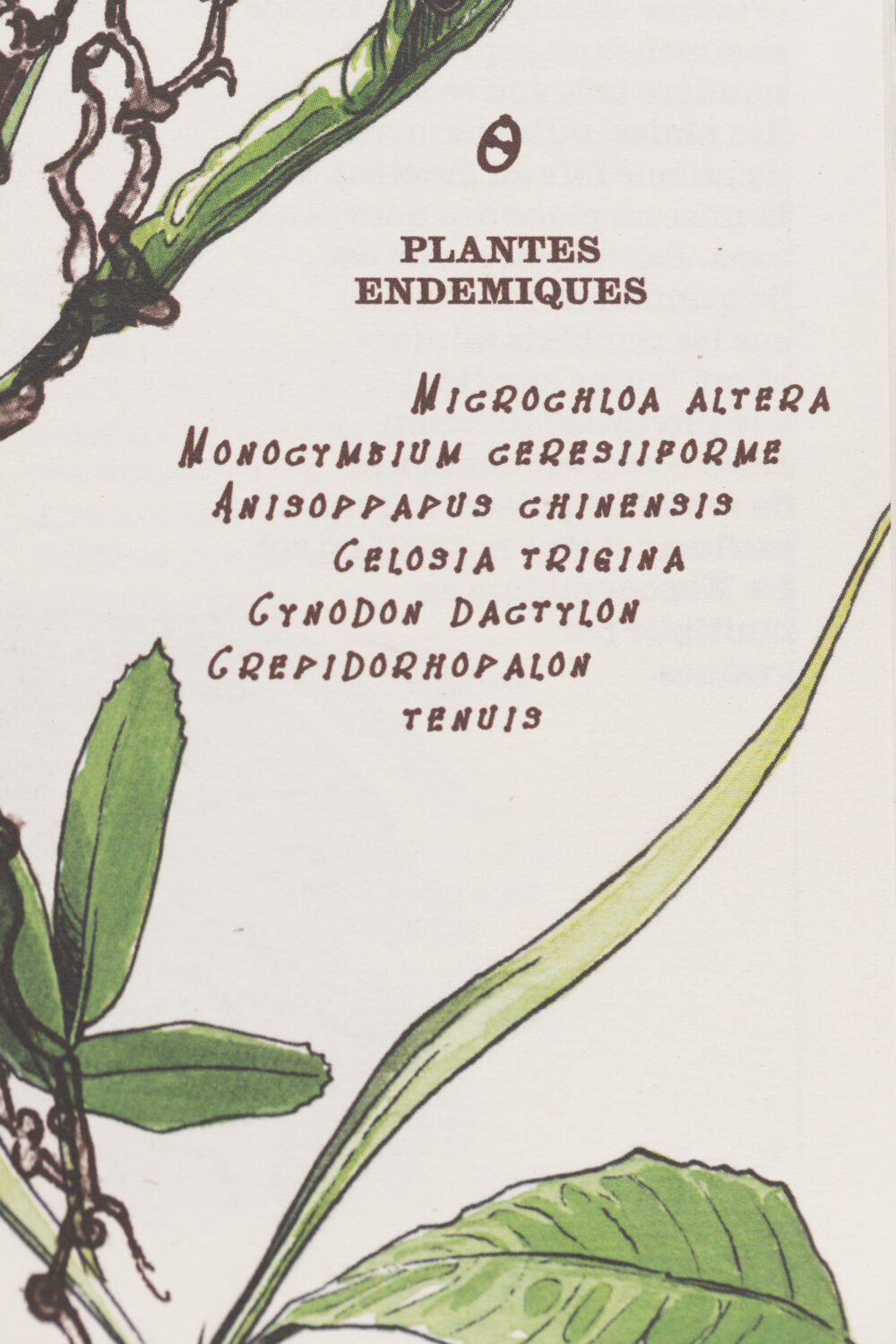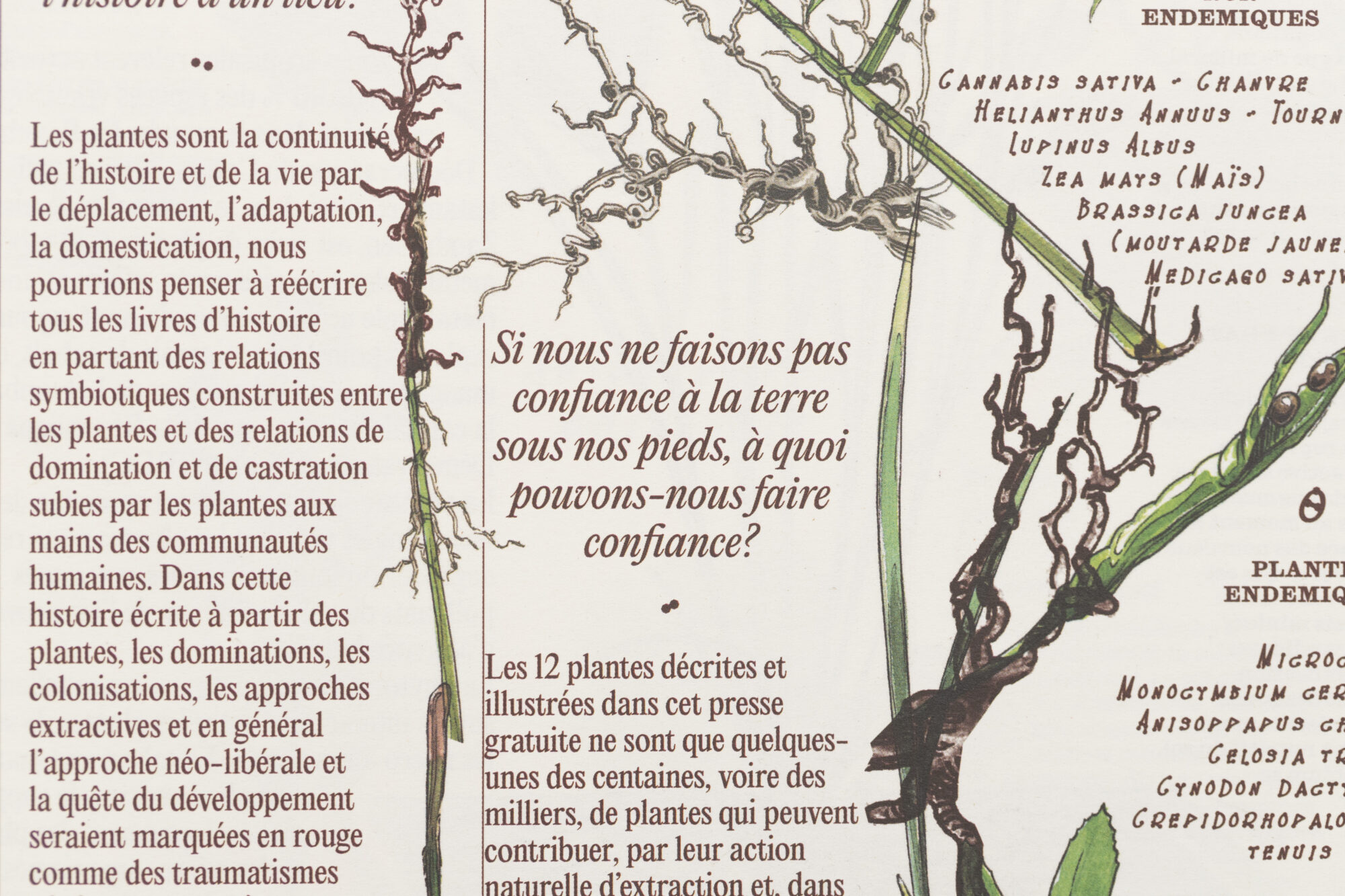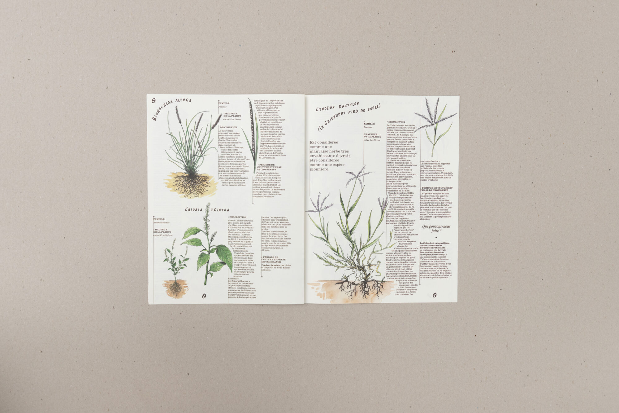 Un ruolo importante all’interno del layout è stato assegnato alla tipografia che combina insieme due caratteri tipografici molto diversi tra loro, ma che insieme costruiscono un ponte con le immagini. Come per esempio i nomi delle piante, in cui il carattere nasce ogni volta dall’unione libera di punti in maniera scritto-grafica e la font dei paragrafi che si ispira alle testate umanistiche dei quotidiani.