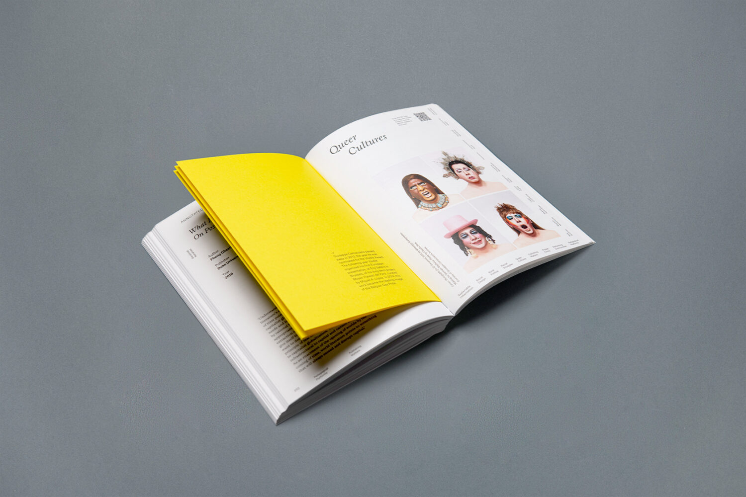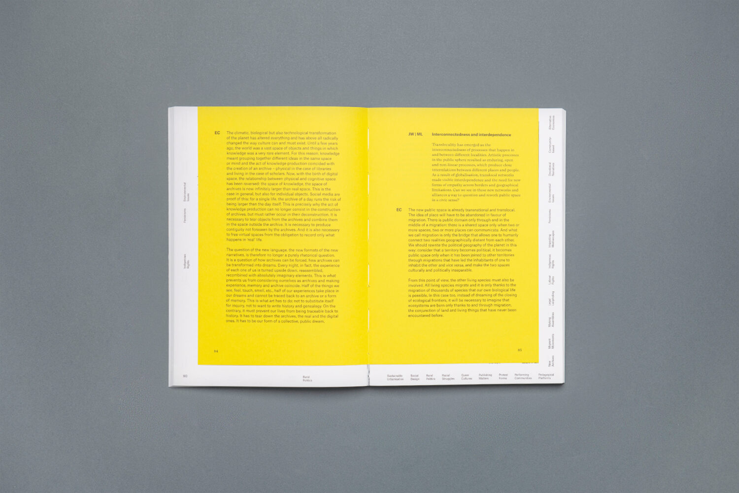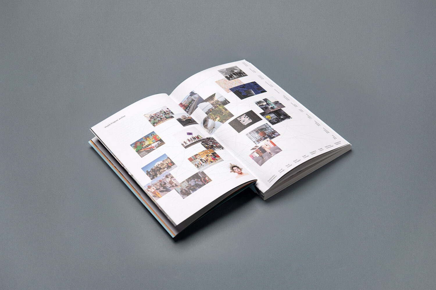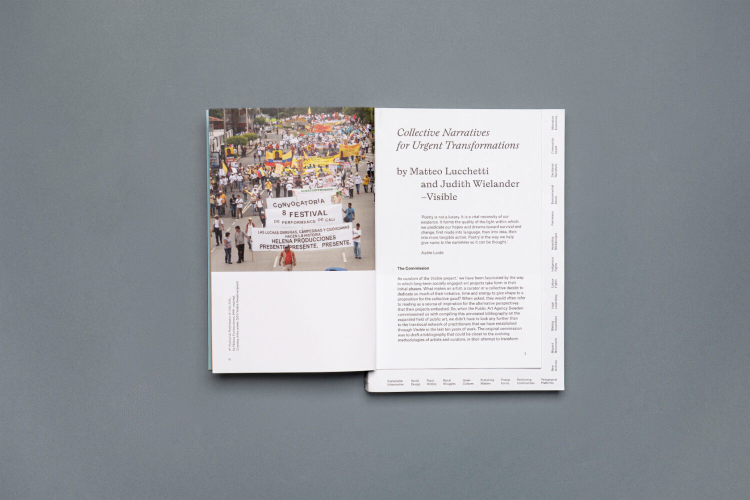 Il nostro contributo alla Collective Annotated Bibliography si sviluppa sulla mediazione dei contenuti attraverso la forma di un libro e di una piattaforma digitale. Abbiamo concepito il libro come uno strumento analogico di ricerca che propone diversi modi per accedere ai contenuti attraverso le parole chiave di Visible project. La pubblicazione ricorda la versatilità di una rubrica indicizzata e invita a sfogliare le pagine seguendo le relazioni di senso anziché una lettura lineare. Il protratto del libro esplora le connessioni tra le parole chiave, le immagini e i contenuti correlati. La copertina è più corta del corpo del libro per introdurre il lettore fin dall’inizio alle parole chiave che Visible project suggerisce come strumento di orientamento nella Collective Annotated Bibliography. Le pagine delle conversazioni introduttive con Emanuele Coccia, Andrea Phillips e Gabi Ngcobo seguono il formato più piccolo della copertina e appaiono nel libro rivelando riflessioni su cosa significa oggi creare una bibliografia che informa e ispira le pratiche artistiche nel campo esteso dell’arte pubblica.