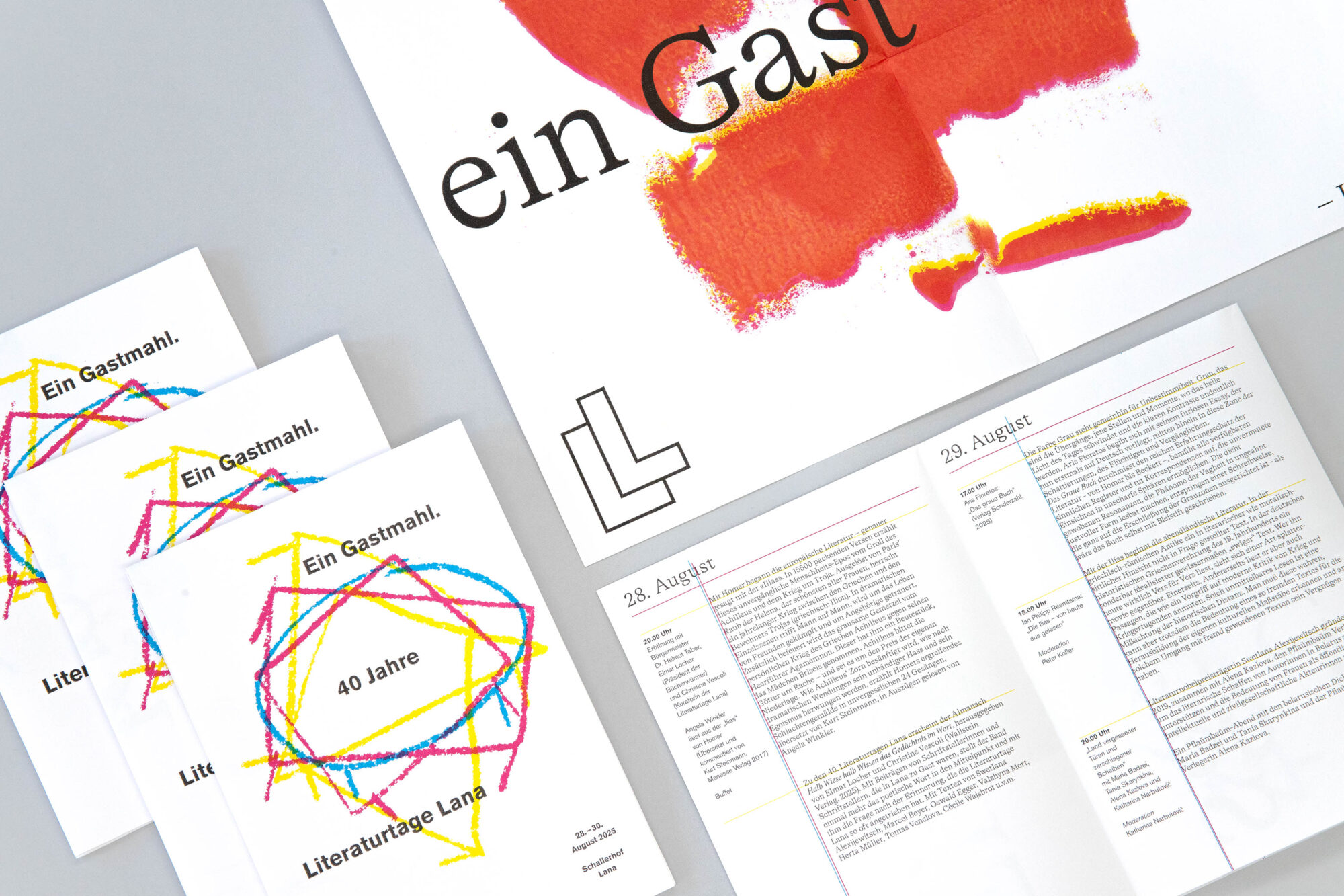 L’identità visiva della 40ª edizione interpreta il concetto di convivio e si sviluppa attorno a un logo progettato appositamente per il quarantesimo anniversario della rassegna, composto da diversi raffigurazioni di tavol, simboli di condivisione e di ritrovo. Il convivio è stato inoltre inteso come uno spazio in cui ognuno lascia un segno, una traccia. Da questa visione nascono diversi segni grafici che, insieme alla tipografia, attraverso interventi diretti nel processo di stampa, si sovrappongono generando effetti di stratificazione e disallineamento. Ne risulta un linguaggio visivo capace di riflettere la pluralità delle voci e la ricchezza degli incontri che da quarant’anni caratterizzano Literaturtage Lana.