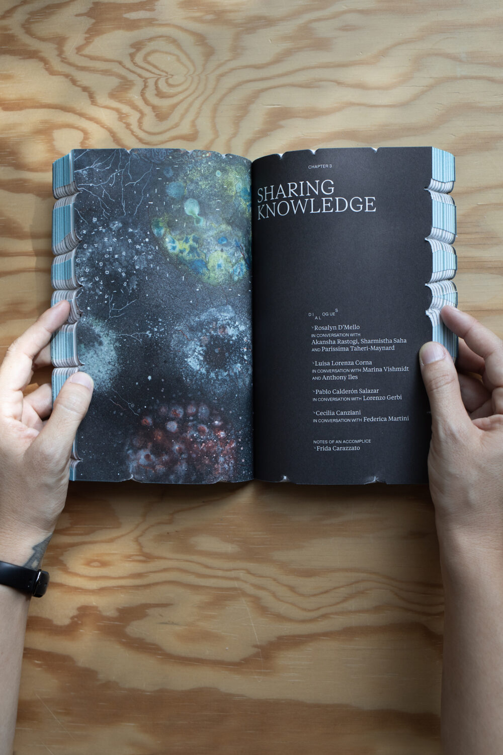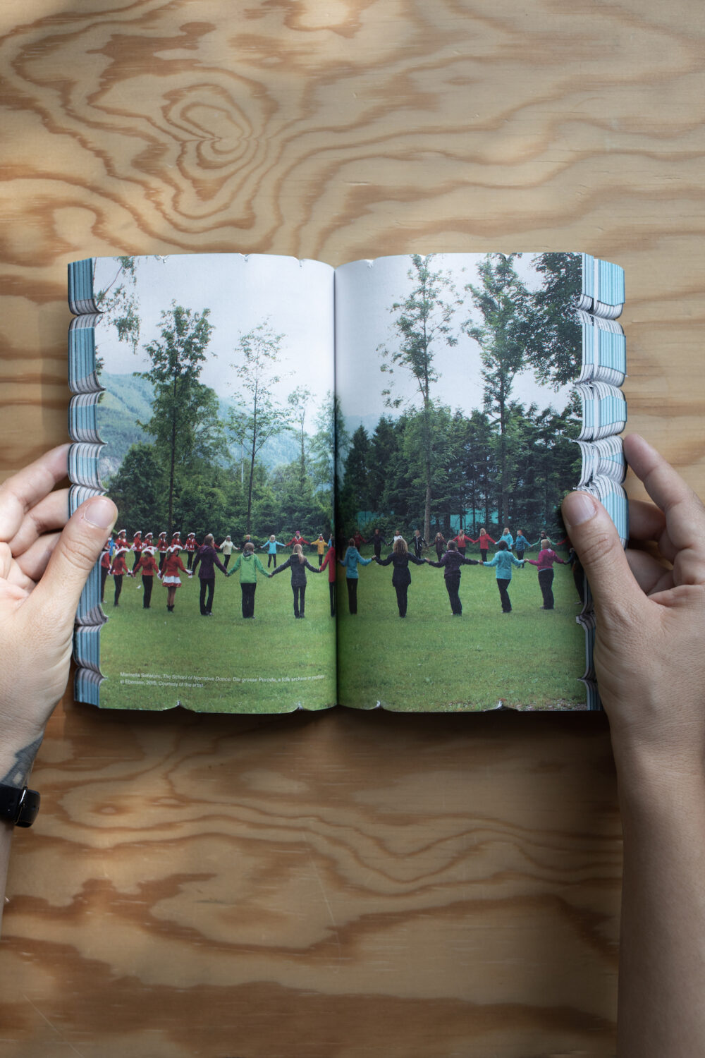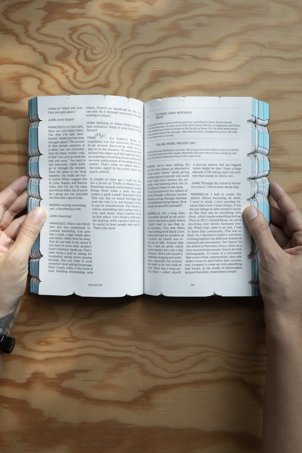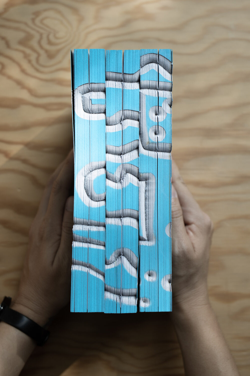 Throughout a day-long performance, Martino Gamper conducted a milling intervention along the frontal cut of each of the 120 copies, resulting in a unique engraving each time—a deliberate violation of the book as an object and its sanctity. This not only rendered each copy distinct but also transformed the experience of handling the book, adding a personalized mark on every page that engaged with other graphic elements in dialogue.