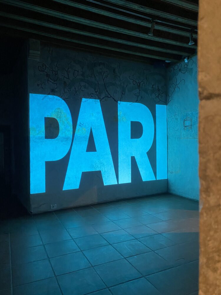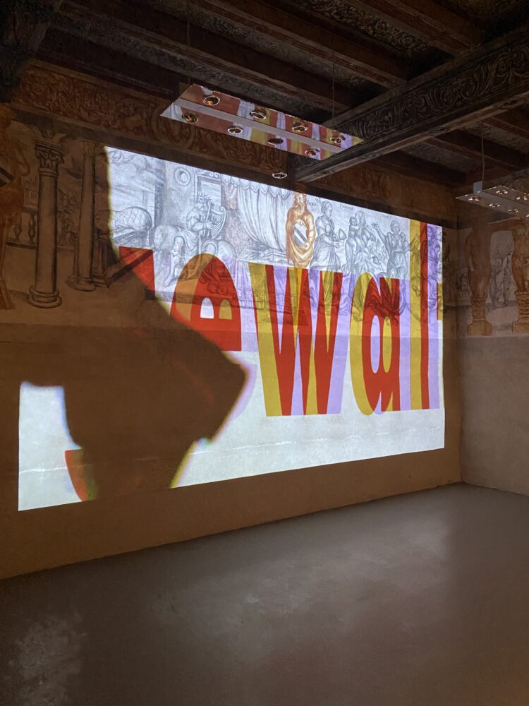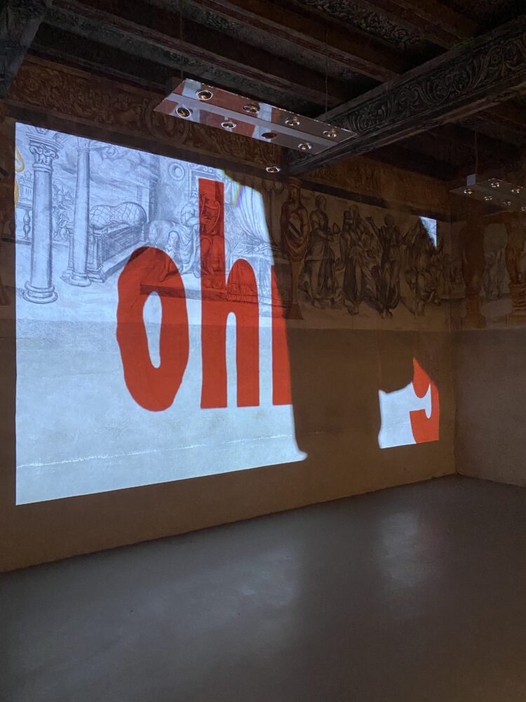 Parallel to the identity, there is a series of panels. Here, the interplay between the two main colours and the typographic distortions creates a space for information on the themes of the animations that is also physical.