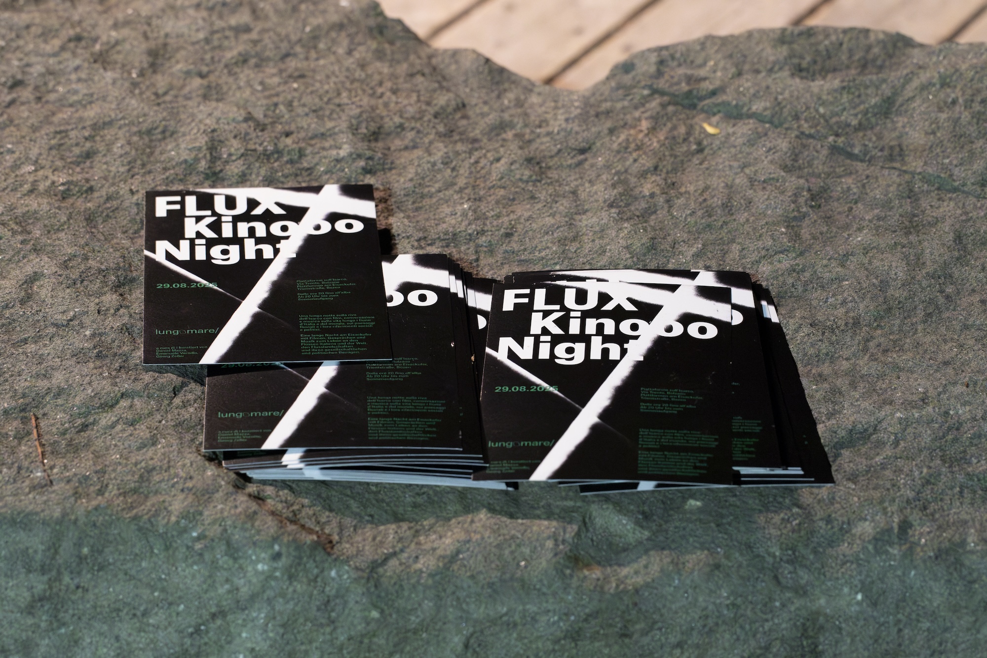 The visual identity of Flux Kinooo Night is born from the encounter of darkness, light, and movement: a design that reflects the very atmosphere of the event — a long night of cinema along the river, where images, stories, and spectators dissolve and recompose under the night sky.