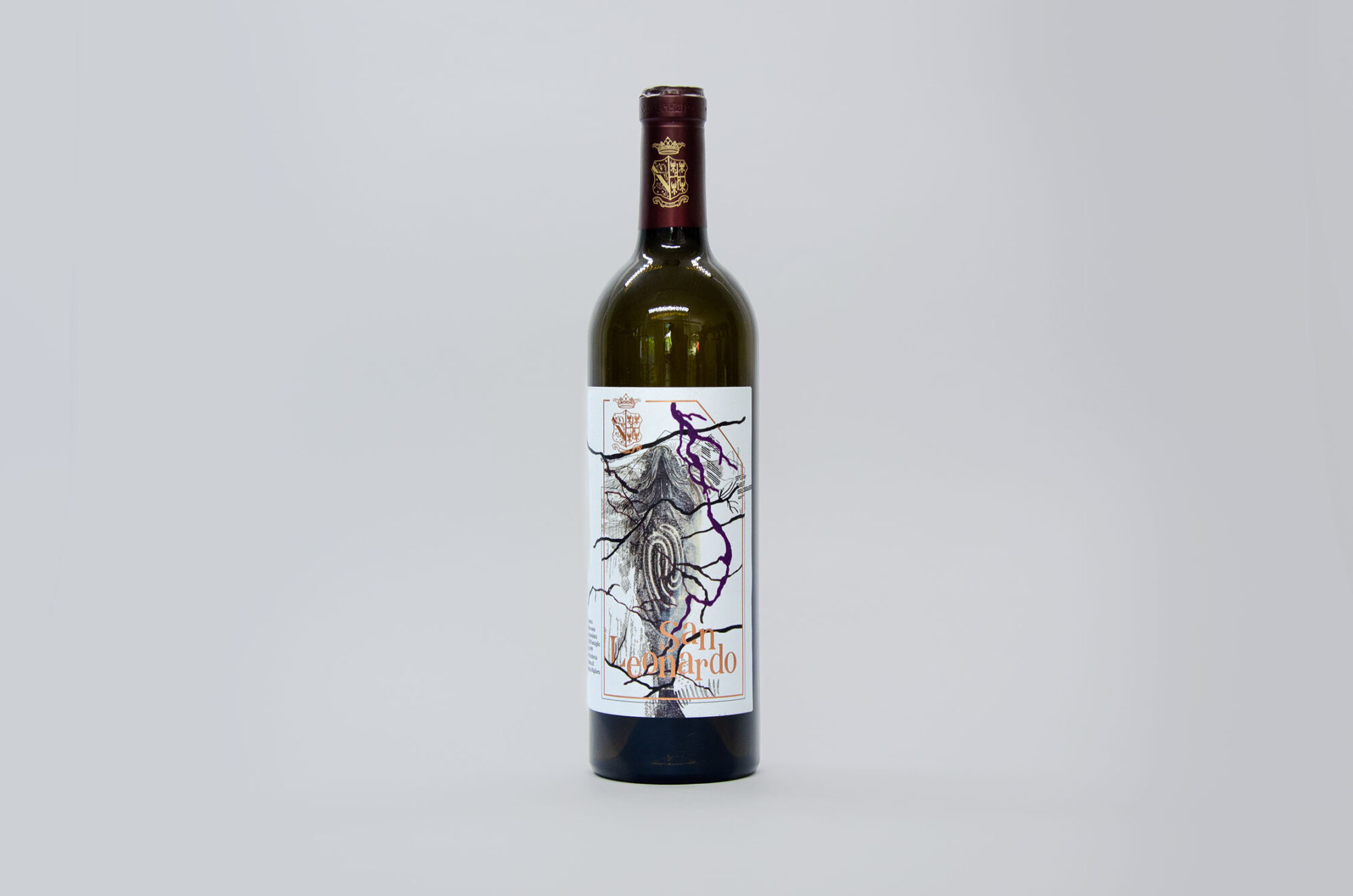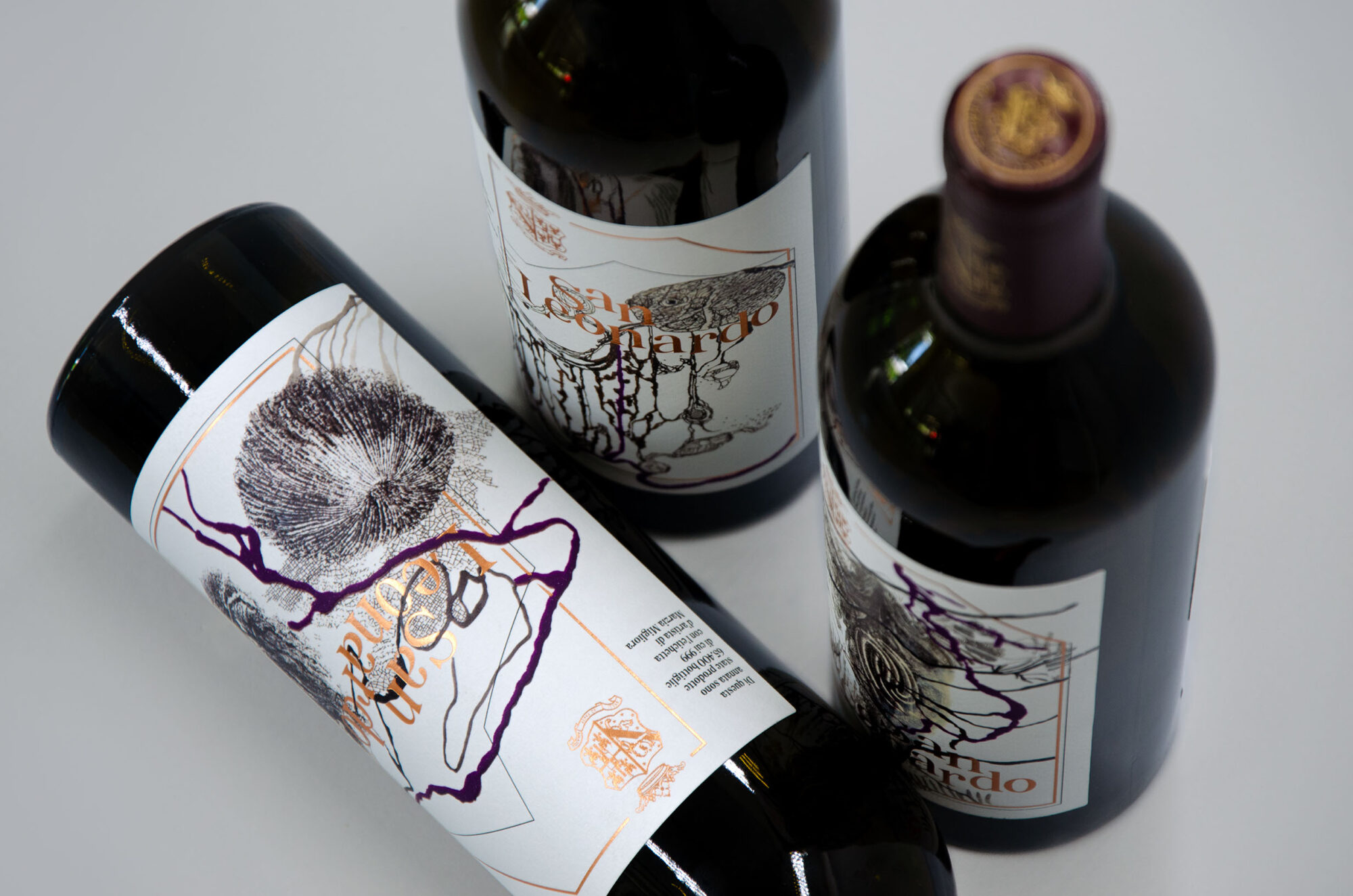 The series of the wine-labels is composed of different details extracted from the paintings, embellished with purple veins that evoke the color of tartar powder and interwoven with brass-colored typography.