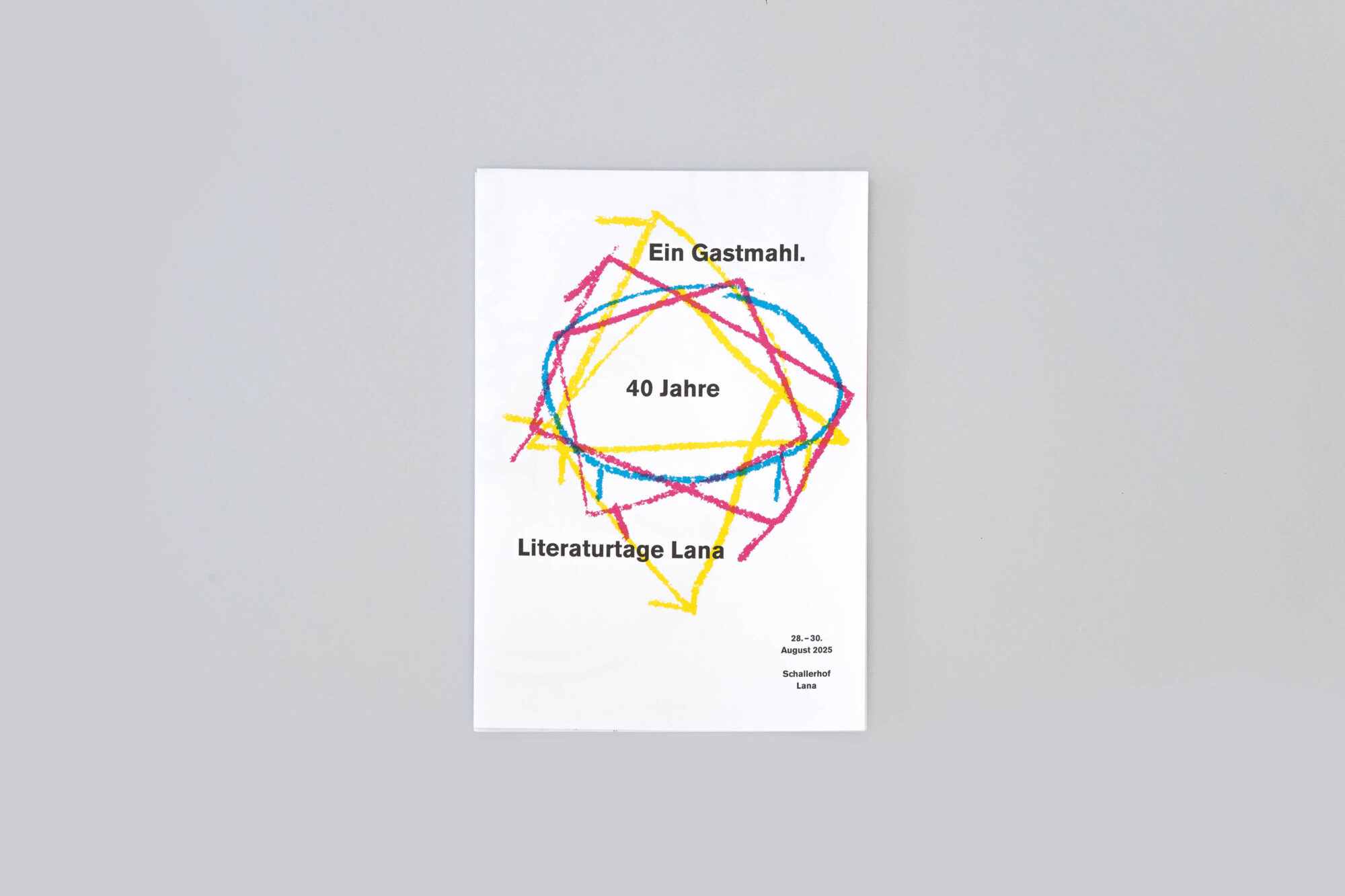 The visual identity of the 40th edition interprets the concept of the convivio and develops around a logo designed specifically for the festival’s fortieth anniversary. The logo is composed of different types of tables, symbols of gathering and sharing. The convivio is conceived as a space in which everyone leaves a mark or trace. This idea gave rise to a series of graphic signs that, through direct interventions in the printing process, interact with the typography to produce effects of stratification and misalignment. The result is a visual language capable of reflecting the plurality of voices and the richness of encounters that have characterized Literaturtage Lana for forty years.