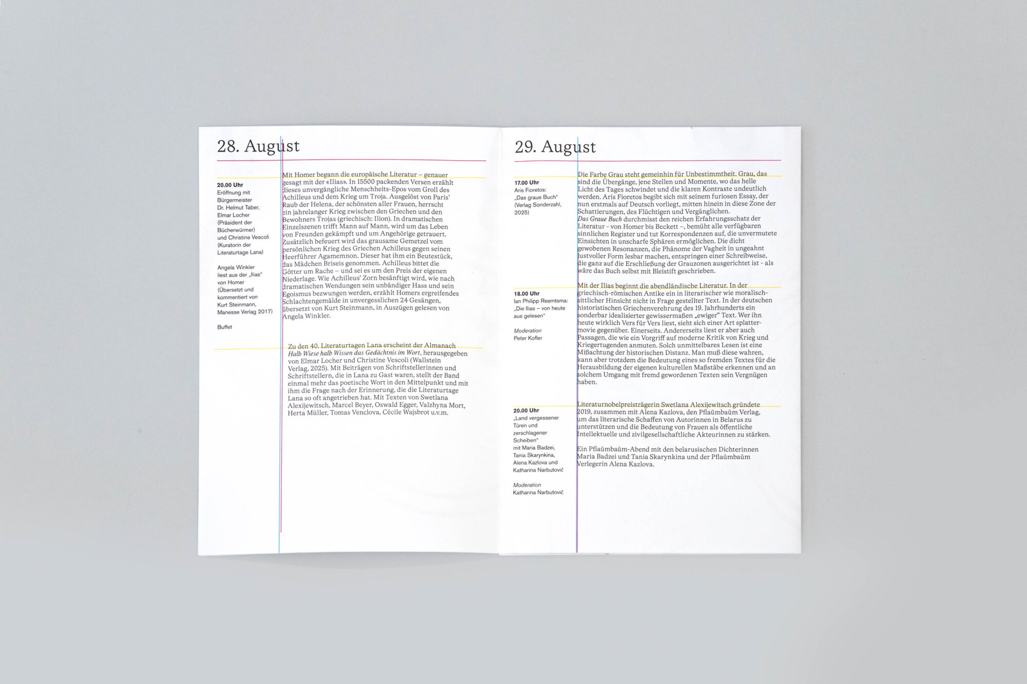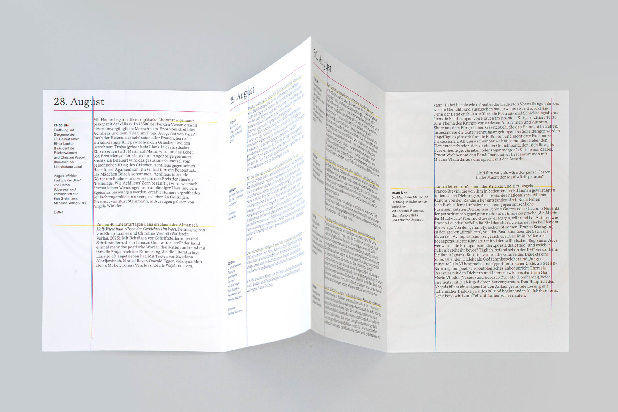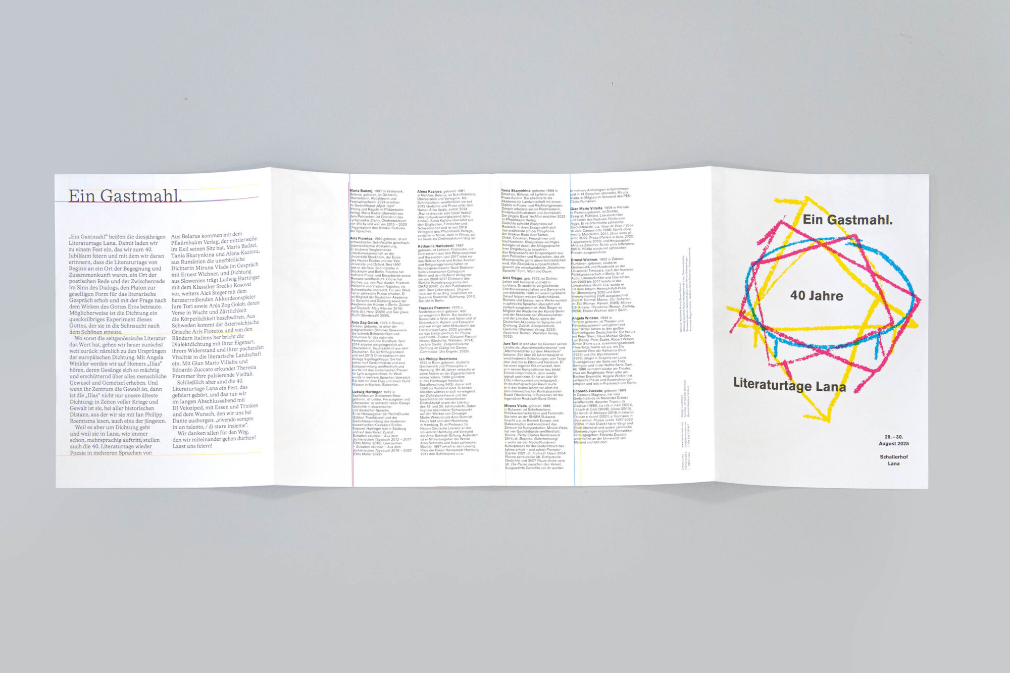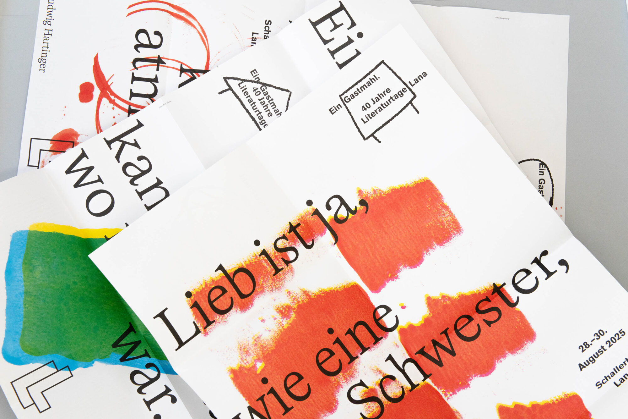 The annual Lana Literature Days (concept and organisation: Literatur Lana) are each dedicated to a specific focus. They are a “literary get-together at the edge of the German-speaking world” and give rise to lively exchange. Since 2016, we have developed the visual concepts for the festival that tie in with the respective annual theme. This results in various communication concepts with their own signature, for example, in the form of writing pads, postcards or posters.