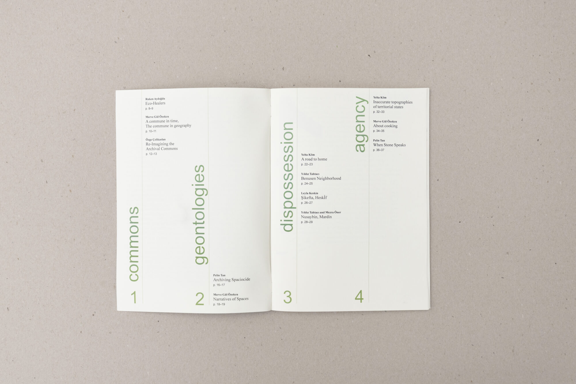 The publication made up of 4 chapters: commons, dispossession, geontologies and agency. On the chapter pages the English introduction mixes in with the keywords written in Turkish, Kurdish and Urdu. The publication consists of mixed materials, small texts, images, visual essays, interviews and excerpt texts from thinkers and theorist. The materials present about the narrative of displaced communicates such as cross-border undocumented immigrants and communing practices in urban/rural spaces to propertyless and precarious women gatherers and livestock producers throughout the Tigris basin.